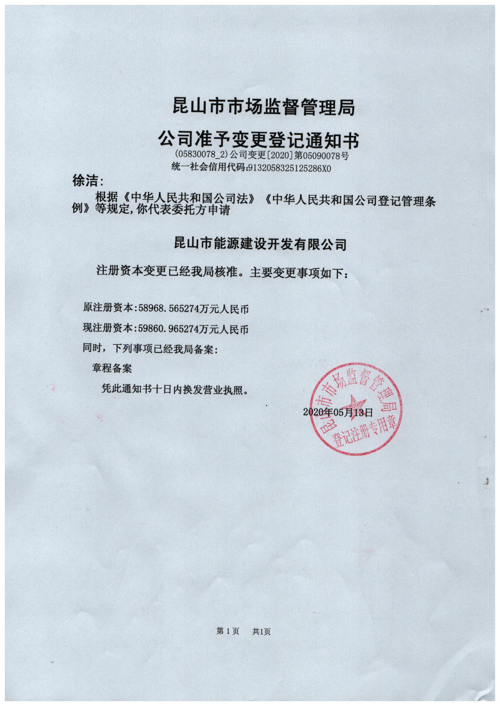 昆山市能源建设开发有限公司于2020年5月13日根据昆创控【2020】30号文关授权北京市朝阳区房地资产的批复,变更公司注册资本。